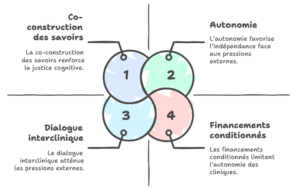 Toutefois, cette ambition transformatrice ne peut pleinement s’accomplir que si certaines conditions sont réunies. Les contraintes budgétaires et institutionnelles, les pressions normatives européennes et les logiques de performance imposées par les bailleurs de fonds constituent des freins structurels qui fragilisent l’autonomie des cliniques. Par ailleurs, les tensions entre interdisciplinarité affichée et cloisonnement disciplinaire, ainsi que la tentation de l’instrumentalisation des cliniques comme caution humanitaire, montrent que l’idéal de justice cognitive reste tributaire d’un contexte international encore largement marqué par la colonialité des savoirs.