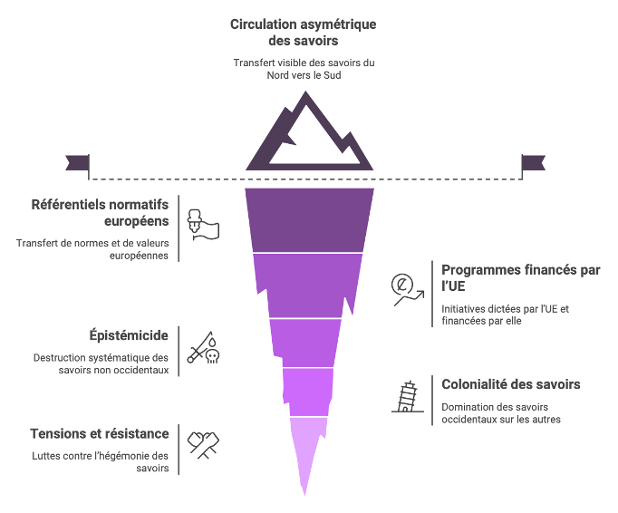 Ensuite, l’analyse de la colonialité des savoirs a permis de démontrer que l’externalisation du contrôle migratoire ne se limite pas à une dimension matérielle ou institutionnelle, mais s’étend également à la sphère épistémique. La diffusion des normes juridiques européennes et des cadres cognitifs du Nord global opère un « épistémicide » au sens de Boaventura de Sousa Santos15, marginalisant les savoirs juridiques locaux et les traditions normatives endogènes. Ainsi, derrière le discours universaliste de la coopération scientifique, se cachent des mécanismes de hiérarchisation cognitive et de diffusion unilatérale des standards européens, qui reconduisent la colonialité des savoirs et restreignent les marges de manœuvre des partenaires du Sud.
